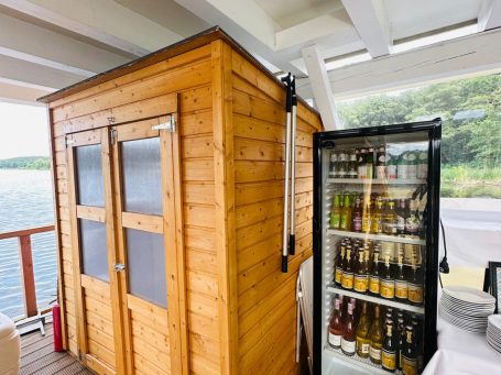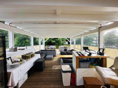 Das Megafloss ist ein echt dickes Ding. Es verfügt über bequeme Loungemöbel mit angepassten Tischen. Der Kühlschrank bietet ausreichend Platz für Erfrischungen und auf einer Cateringstrecke von 2,20m mit zweiter Etage können Sie ihre Spiesen abstellen.